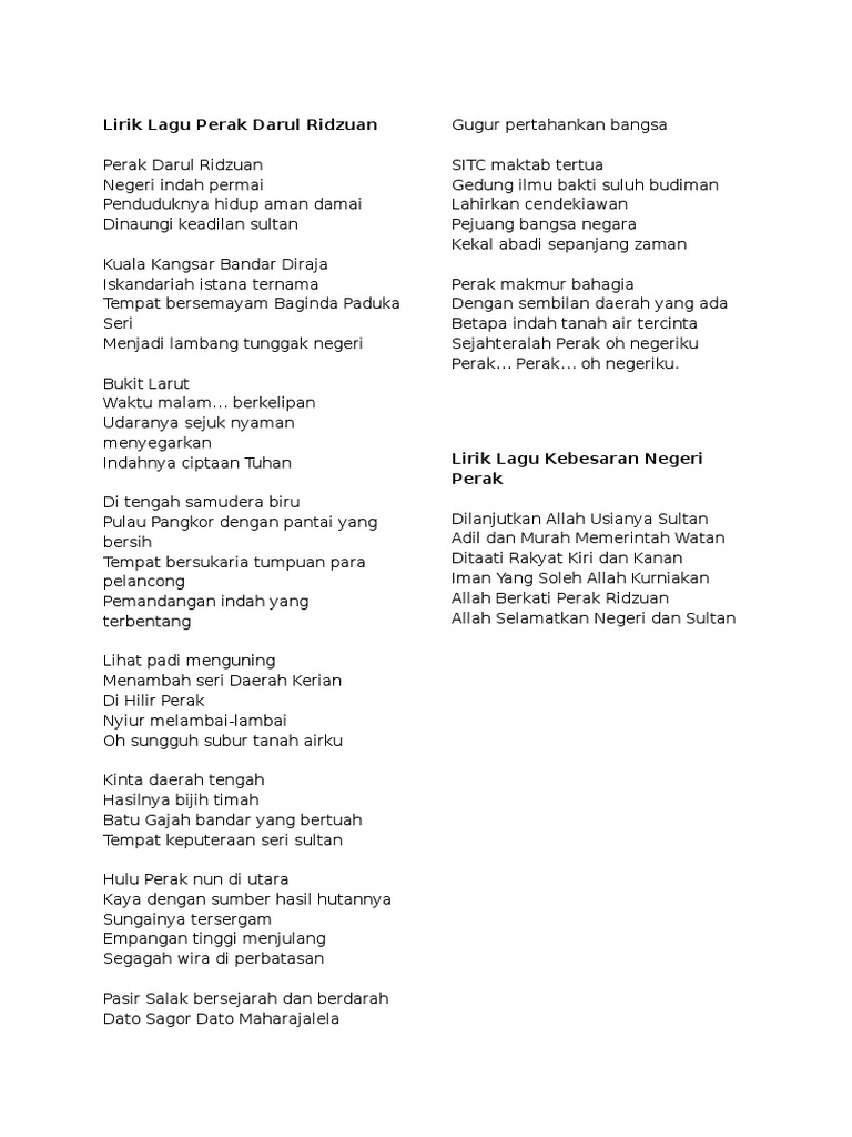 Lirik lagu perak darul ridzuan perak darul ridzuan negeri indah permai penduduknya hidup aman damai dinaungi keadilan sultan kuala kangsar. Untuk rakyat perak yang mencari lirik lagu negeri perak disini kami sertakan lagu. Lirik laguDilanjutkanAllah usianya sultanAdil dan murah memerintah watanDitaati rakyat kiri dan kananIman yang soleh Allah kurniakanAllah berkati Perak Ridz.